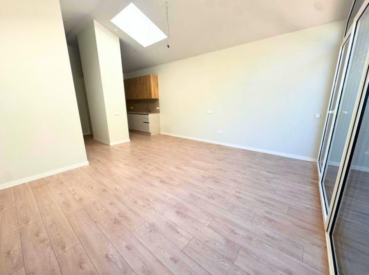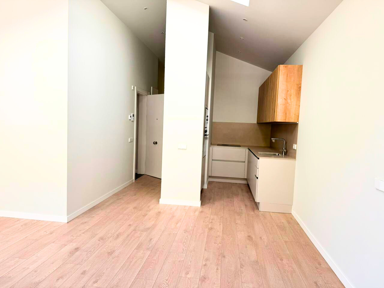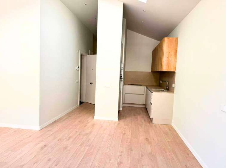 La vivienda dispone de 2 dormitorios y 2 baños, con una distribución moderna y funcional. El corazón del piso es un amplio salón-comedor con cocina abierta, totalmente equipada con electrodomésticos de alta gama, y con techos altos que siguen la forma del tejado, aportando una gran sensación de amplitud y luminosidad.